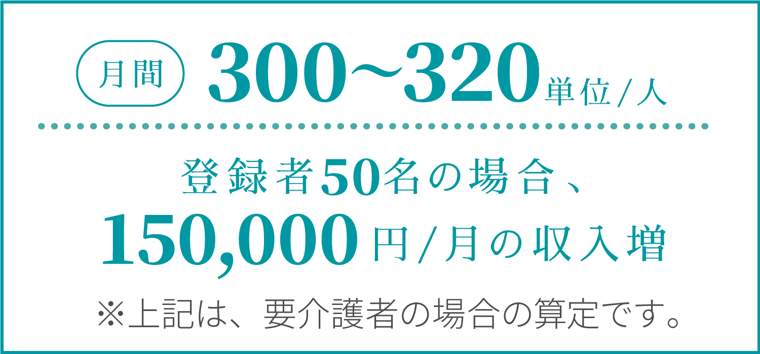 〈算定条件〉 ・口腔機能向上加算算定可能者が50名・一人あたり、150単位×2回/月にて算定